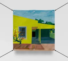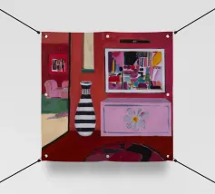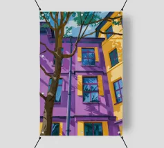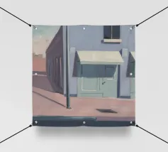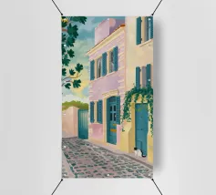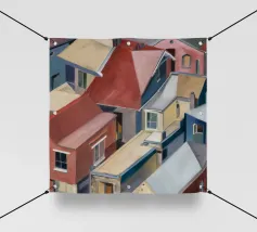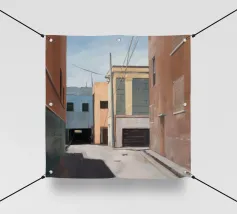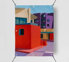 Una complessa scena urbana è resa con un'attenzione particolare alle forme geometriche e a un'audace tavolozza di colori rosa, verde acqua e rosso. Una scala esterna fornisce un forte elemento compositivo, guidando l'occhio attraverso le forme architettoniche astratte.