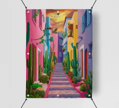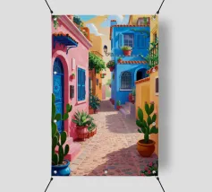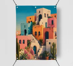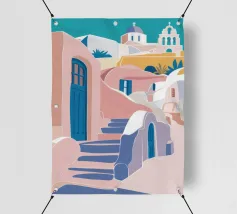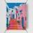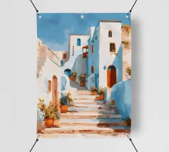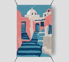 Quest'opera d'arte cattura la bellezza iconica di un'isola greca con i suoi gradini vivaci e colorati nei toni del rosa, dell'arancione e del rosso. La classica architettura bianca e blu incornicia la scena, creando un'immagine gioiosa e pittoresca che trasporta immediatamente in un vicolo soleggiato di Santorini.
