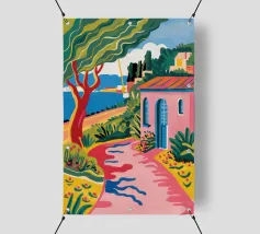 Quest'opera d'arte cattura la bellezza iconica di un'isola greca con i suoi gradini vivaci e colorati nei toni del rosa, dell'arancione e del rosso. La classica architettura bianca e blu incornicia la scena, creando un'immagine gioiosa e pittoresca che trasporta immediatamente in un vicolo soleggiato di Santorini.