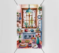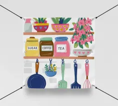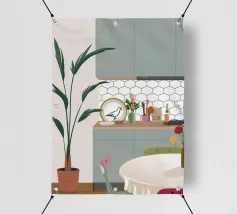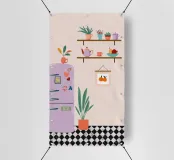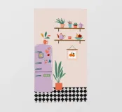 Illustrazione di uno scaffale con una collezione di piante colorate e un arredamento eclettico su un pavimento a scacchi. La scena è una rappresentazione affascinante, vivace ed elegante dell'angolo curato di un amante delle piante.