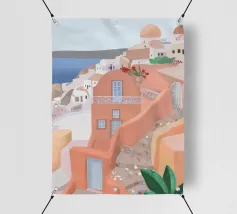 Una classica scena mediterranea che raffigura un edificio rosa con una scala che scende verso un tranquillo mare blu. Quest'opera d'arte cattura perfettamente il fascino solare e pacifico di un'isola greca.