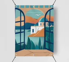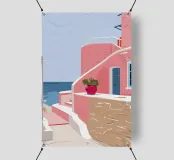 Una classica scena mediterranea che raffigura un edificio rosa con una scala che scende verso un tranquillo mare blu. Quest'opera d'arte cattura perfettamente il fascino solare e pacifico di un'isola greca.