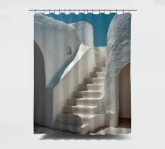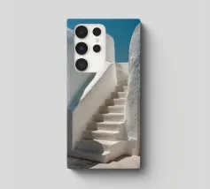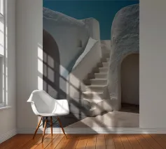 Scala bianca scolpita con curve organiche e pareti strutturate, immersa nella luce sotto un cielo blu intenso, in uno stile mediterraneo minimalista. Una tavolozza di luce bianca e azzurra, ideale per un arredamento contemporaneo, raffinato e architettonico. Perfetta per un soggiorno, una camera da letto o un ufficio creativo, per creare un'atmosfera estiva calma e stimolante.