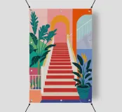 Scale rosse e vivaci conducono attraverso un edificio colorato e semplificato verso un lussureggiante ingresso ad arco, suggerendo un viaggio verso una destinazione bella ed esotica.