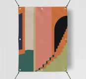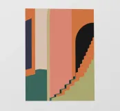 Un'opera architettonica astratta incentrata su scale e piani geometrici in una calda tavolozza di rosa, arancio e terracotta. La composizione gioca con luci e ombre, creando un senso di infinita e tranquilla ascesa.