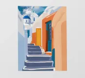 Guardando su per una stretta scala arancione e assolata verso una scheggia di cielo blu intenso e una porta, si crea una scena di viaggio calda, invitante e pittoresca.