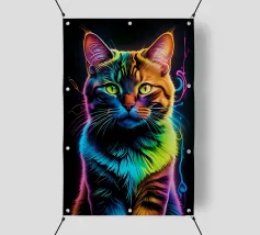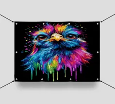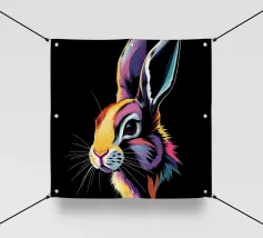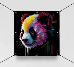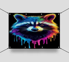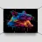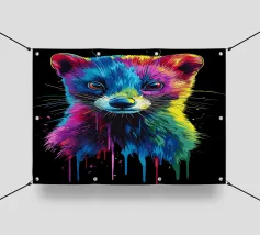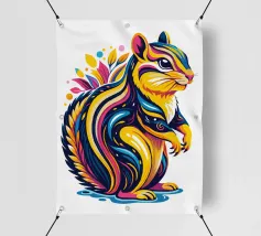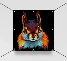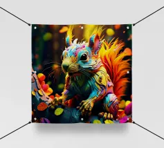 Uno scoiattolo curioso si affaccia vivacemente dal quadro, raffigurato con colori intensi e brillanti su uno sfondo nero. La tavolozza dei colori spazia dal blu intenso e dal rosa brillante al giallo caldo e al rosso vibrante. I passaggi sono fluidi e ricordano le pennellate, mentre singoli schizzi e gocce di colore conferiscono al motivo un effetto dinamico, quasi esplosivo. L'animale appare vigile e vivace, con dettagli finemente lavorati nella sua pelliccia e un grande occhio lucido che guarda direttamente lo spettatore.