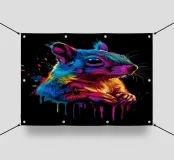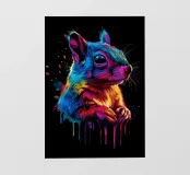 Uno scoiattolo curioso si affaccia vivacemente dal quadro, raffigurato con colori intensi e brillanti su uno sfondo nero. La tavolozza dei colori spazia dal blu intenso e dal rosa brillante al giallo caldo e al rosso vibrante. I passaggi sono fluidi e ricordano le pennellate, mentre singoli schizzi e gocce di colore conferiscono al motivo un effetto dinamico, quasi esplosivo. L'animale appare vigile e vivace, con dettagli finemente lavorati nella sua pelliccia e un grande occhio lucido che guarda direttamente lo spettatore.