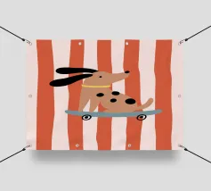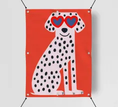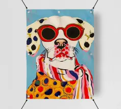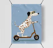 Un'illustrazione stravagante di un cane dalmata felice con un collare rosso, che cavalca con sicurezza un monopattino su uno sfondo blu chiaro, trasmettendo gioia pura ed energia giocosa.