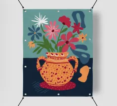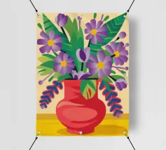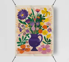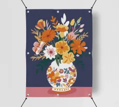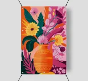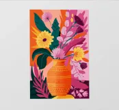 Un vibrante bouquet di fiori astratti dai ricchi colori arancione, viola e giallo erompe da un vaso arancione su uno sfondo scuro, trasmettendo un'intensa energia e una scenografica esposizione floreale.
