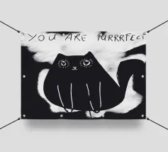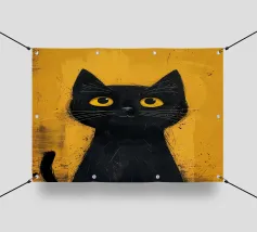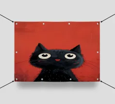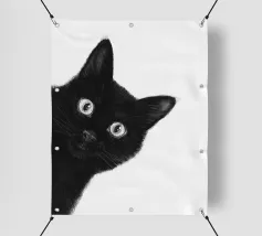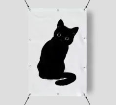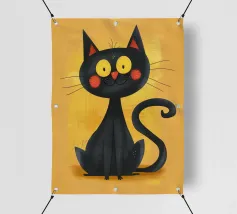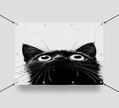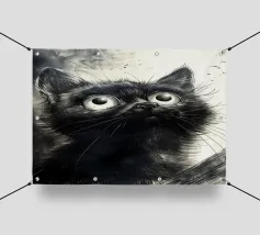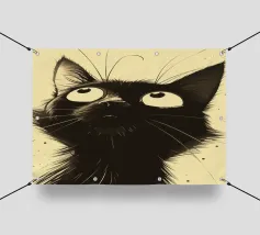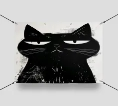 Illustrazione minimalista in bianco e nero di un elegante gatto nero con occhi esageratamente grandi e lineamenti abbozzati. Il disegno astratto e stravagante del gatto aggiunge un tocco artistico e giocoso.