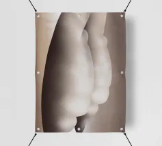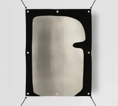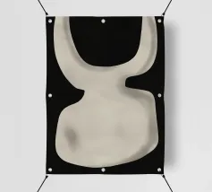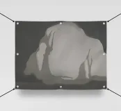 Una rappresentazione monocromatica presenta una forma accartocciata che ricorda in qualche modo una montagna o una formazione rocciosa. Le ombre e le lumeggiature sono state utilizzate per dare alla forma un aspetto tridimensionale, e poggia su uno sfondo più scuro che ne esalta la silhouette.