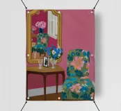 Una scena d'interni con una poltrona vuota rivestita con un motivo chintz floreale, riflessa in un grande specchio. La stanza è dipinta nei toni del rosa e del rosso, creando un'atmosfera calda, accogliente e leggermente nostalgica.