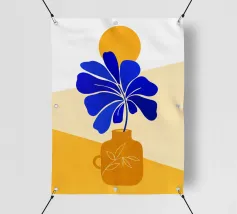 Un singolo ed elegante fiore rosa sboccia in un semplice vaso di terracotta su un morbido sfondo blu, creando un pezzo minimalista e sereno che celebra la tranquilla bellezza di un singolo fiore.