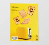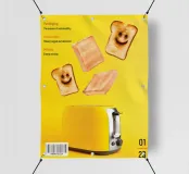 Fette di pane tostato con facce sorridenti fluttuano sopra un tostapane giallo. Sullo sfondo sono presenti testi sul confezionamento, la produzione e la miscelazione, che sottolineano la sostenibilità e il risparmio energetico.