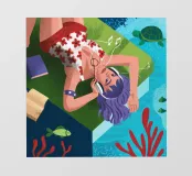 Una persona con cuffia e occhialini retrรฒ galleggia tranquillamente nell'acqua turchese, circondata da pesci colorati e piante acquatiche, creando una scena subacquea serena e onirica.