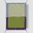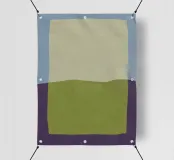 Domina uno stile minimalista con ampie fasce di colore blu, verde e viola, separate da linee rette per creare una composizione segmentata. L'elemento centrale ricorda un paesaggio stilizzato con un primo piano, un orizzonte e un cielo semplificati.