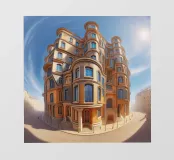 Una struttura architettonica surreale con caratteristiche curve e distorte, che fonde stili classici e moderni, si erge sotto un cielo blu brillante. La strada di ciottoli e la luce soffusa del sole esaltano l'atmosfera stravagante e onirica.