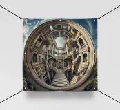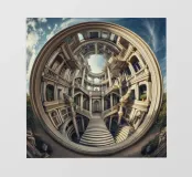 Una struttura architettonica circolare mozzafiato con archi intricati, colonne e una grande scalinata emana eleganza e simmetria. Gli accenti di verde lussureggiante e il cielo drammatico esaltano l'atmosfera artistica e surreale di questo design unico.