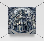 Una splendida vista fisheye di un atrio futuristico caratterizzato da un'architettura geometrica, balconi e un soffitto a cupola di vetro. L'intricato gioco di forme e luci crea un design urbano coinvolgente e di grande impatto visivo.