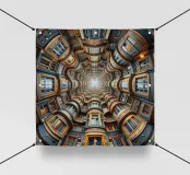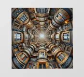 Una straordinaria composizione architettonica che mostra un tunnel simmetrico di finestre dal design intricato, dettagli ornamentali e accenti vivaci che convergono verso un punto di fuga luminoso. La prospettiva dinamica evidenzia la maestria artigianale e crea un'illusione di profondità infinita.