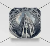 Un'accattivante vista con lente fisheye di un edificio in stile neoclassico circondato da strutture ornamentali in un cortile urbano. La prospettiva distorta enfatizza i dettagli intricati, la simmetria e la grandezza architettonica della scena.