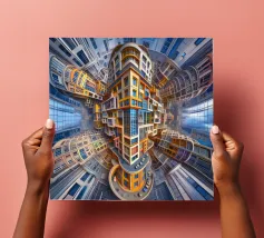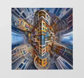 Una composizione architettonica colorata e astratta che presenta forme curve, strutture modulari e vivaci motivi di finestre, creando una scena urbana surreale con geometrie e riflessi dinamici.