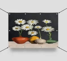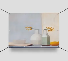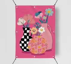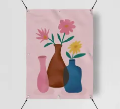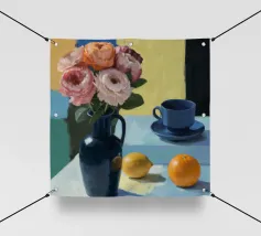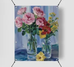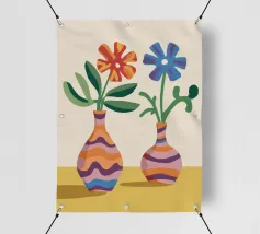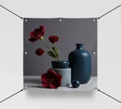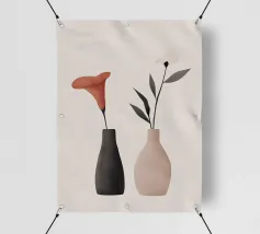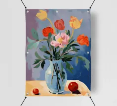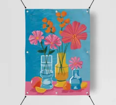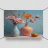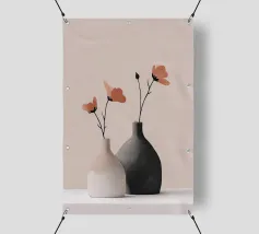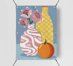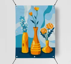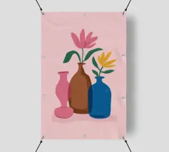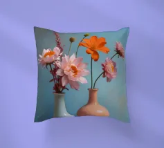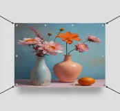Elegante poster di natura morta con vasi in ceramica dai toni pastello riempiti di fiori sbocciati rosa e arancioni, su un morbido sfondo blu. Perfetto per aggiungere un tocco artistico e sereno agli interni moderni. Ideale per gli amanti dell'arte e dell'arredamento in cerca di ispirazione floreale.