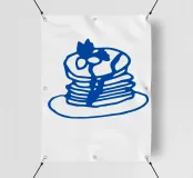 Una pila di pancake conditi con sciroppo e una guarnizione è rappresentata in uno stile minimalista di line art blu. Il design enfatizza la semplicità e le immagini a tema colazione.
