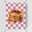 Una pila di pancake è sormontata da fragole e irrorata di sciroppo, su uno sfondo a scacchi bianchi e rosa. I colori vivaci e lo sciroppo lucido creano un aspetto invitante.