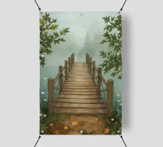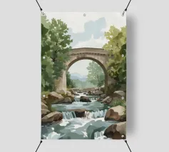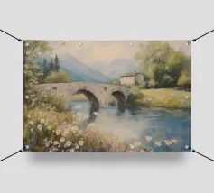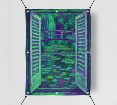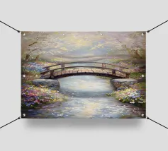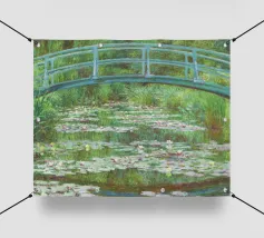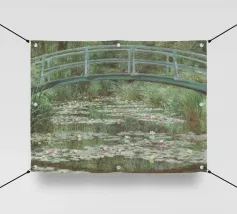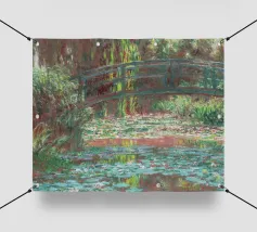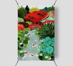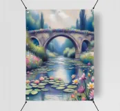 Disegno a pastello di un ponte con laghetto di ninfee sottostante.