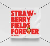"Le parole 'Strawberry Fields Forever' sono impilate verticalmente in caratteri rossi su uno sfondo chiaro, con una fragola a fette che sostituisce lo '0' di 'Forever', creando un'atmosfera stravagante e nostalgica",
