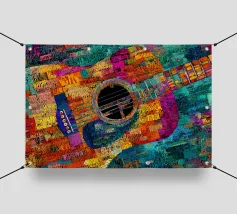 A modern abstract painting featuring geometric shapes forming guitars, violins, and musical notes in a bold, colorful composition. The textured background and dynamic arrangement evoke a sense of rhythm and artistic expression.