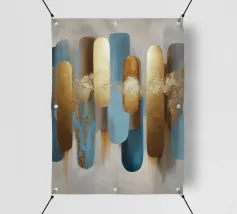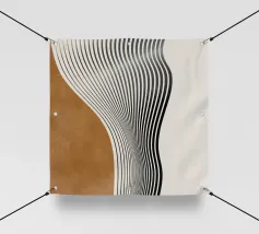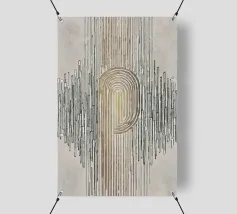 Questa illustrazione astratta combina forme geometriche e linee sottili in un design minimalista che gioca con accenti beige e oro. La disposizione simmetrica e i tratti stretti creano una struttura elegante che presenta elementi vintage e grunge. Perfetta per gli amanti dell'estetica scandinava, l'opera irradia una bellezza senza tempo.