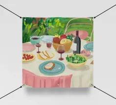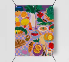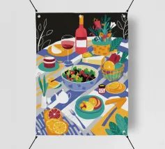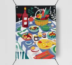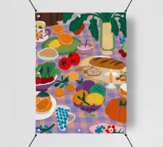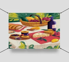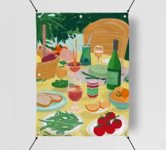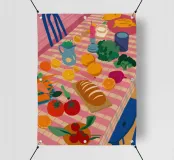 Un pranzo rustico è distribuito su un tavolo, con una pagnotta di pane, broccoli freschi e pomodori. Lo stile pittorico ed espressivo e i colori caldi creano un'atmosfera di sana e comune alimentazione, evocando il semplice piacere di un pasto condiviso.