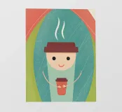 Allegra illustrazione con una simpatica tazza di caffè che abbraccia una piccola tazzina di caffè, irradiando calore e un sorriso a ogni sorso.