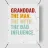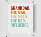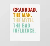 Su uno sfondo verde scuro, un testo in grassetto descrive con umorismo un nonno come "L'uomo, il mito, la cattiva influenza", utilizzando una giocosa sfumatura di colori. I colori vanno dal rosso al giallo e al blu, offrendo un vibrante contrasto.