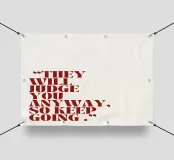 "La citazione "THEY WILL JUDGE YOU ANYWAY, SO KEEP GOING", impilata su più righe, è resa in un font serif e in grassetto con una tonalità di rosso intenso su uno sfondo morbido e bianco, che trasmette un messaggio di resilienza e perseveranza di fronte alle critiche",