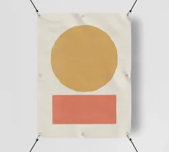 Un'opera d'arte geometrica calma e di grande effetto: il cerchio e il rettangolo si fondono in un'unità armoniosa attraverso dolci sfumature di colore in giallo, rosa e blu. Questo design dona equilibrio visivo e una sottile colorazione a qualsiasi ambiente, ideale per ambienti moderni, interni scandinavi o spazi di lavoro creativi.