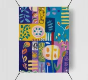 Una vibrante e intricata composizione astratta che ricorda una trapunta patchwork, con pannelli distinti pieni di foglie stilizzate, elementi floreali e motivi astratti in una ricca gamma di colori. La disposizione organizzata e giocosa crea un senso di artigianalità.