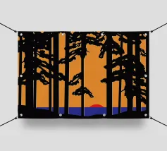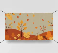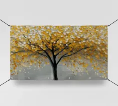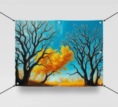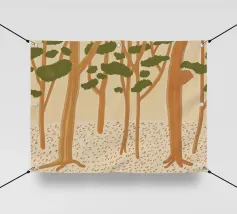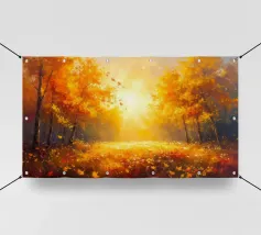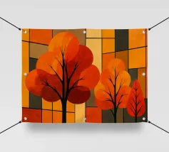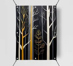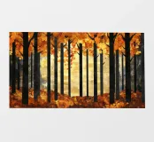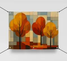 Una splendida rappresentazione astratta di una foresta autunnale con alti tronchi scuri e fogliame dorato. Lo sfondo caldo e luminoso esalta la composizione geometrica, creando un'atmosfera serena e moderna.