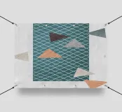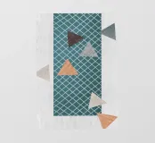 Le forme geometriche sono disposte su uno sfondo strutturato, caratterizzato da un motivo a griglia verde acqua. I triangoli di varie tonalità creano un contrasto visivo dinamico.