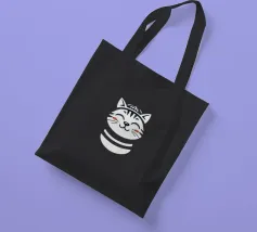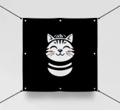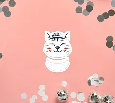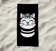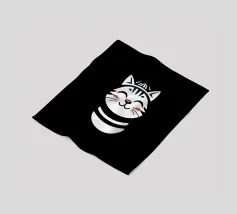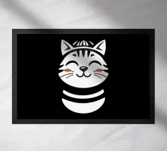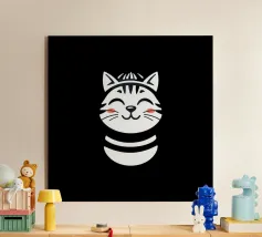 Un adorabile gatto dei cartoni animati sorride vivacemente, indossa una camicia a righe e un berretto, emanando un'atmosfera giocosa e felice su uno sfondo scuro.