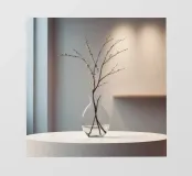 Un vaso di vetro trasparente contiene esili rami con piccoli boccioli, elegantemente esposti su un tavolo rotondo bianco. Gli interni tranquilli sono caratterizzati da luci soffuse e da un'estetica minimalista che favorisce la tranquillità.