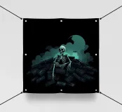 Uno scheletro reclinato in mezzo a una pila di cassette vintage, circondato da una nebbia spettrale e da sagome inquietanti, che evocano un'atmosfera nostalgica e agghiacciante, perfetta per Halloween.