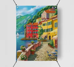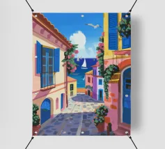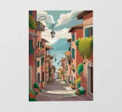 Una veduta prospettica di una strada europea stretta e tortuosa, fiancheggiata da edifici colorati, piante in vaso e diretta verso un cielo luminoso e nuvoloso.