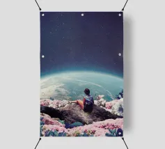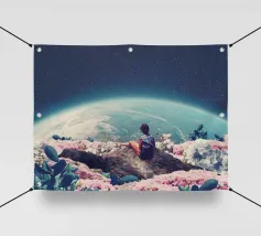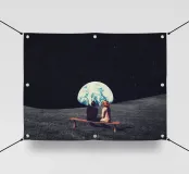 Vivevamo lì. Ricordate? Quel mondo ci sta ancora aspettando. ~ Coppia seduta su una panchina che guarda la Terra surreale retro futuristico stellato composizione romantica. versione orizzontale