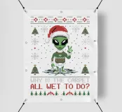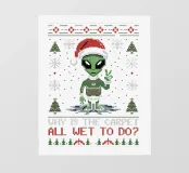 Un alieno con cappello da Babbo Natale e maglione natalizio è circondato da fiocchi di neve e alberi di Natale. Il disegno chiede ironicamente: "Perché il tappeto è tutto bagnato?" con colori festosi.