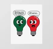 Due lampadine dei cartoni animati, una verde e una rossa, si confrontano in una conversazione scherzosa sul lavoro durante le vacanze. La lampadina verde pone la domanda, mentre la lampadina rossa risponde con umorismo.