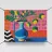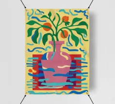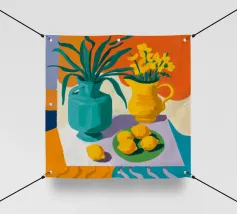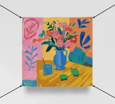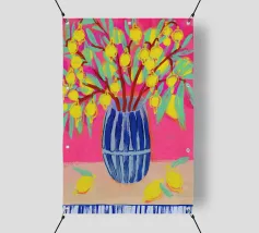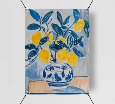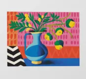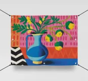 Un vivace bouquet di fiori e agrumi si trova in un vaso blu su un tavolo rosa. Lo sfondo è un mix dinamico di motivi a zig zag in bianco e nero e foglie verdi, che creano una natura morta moderna e giocosa.